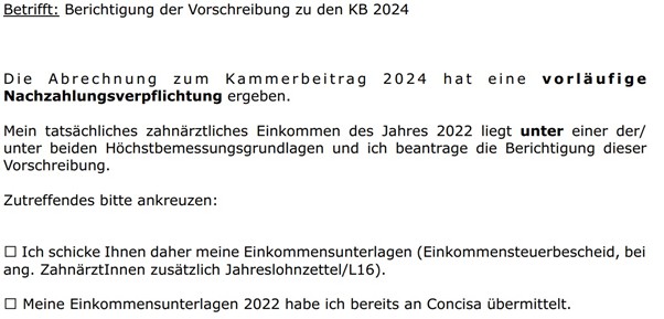 Sie erhalten eine Vorschreibung nach den Höchstbemessungsgrundlagen, weil sie entweder mit Ihrem zahnärztlichen Einkommen darüber liegen oder Concisa noch keine Einkommensunterlagen für das Jahr 2022 vorliegen. Stellen Sie in diesem Fall jedenfalls den Berichtigungsantrag. Dieser liegt der Vorschreibung als Extraseite (siehe Screenshot) bei und lautet bereits auf Ihren Namen. Das Formular für den Berichtigungsantrag finden Sie auch unter diesem Link. Der Antrag auf Berichtigung kann auch formlos gestellt werden. Es reicht der Hinweis: „Kammerbeiträge 2024 bitte berichtigen, ESt-Bescheid/Jahreslohnzettel anbei“.